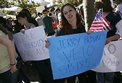 소수자 우대 차별 전형 (affirmative action)을 복구하려 하는 로날드 크루즈(Ronald Cruz)는 버클리 학교의광장 (Sproul Hall)에서 연설했다.