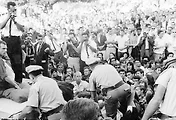 베이크 세일에 반대하는 의사를 표시하기 위해 캠퍼스 앞 스프라울 광장에 드러누운 학생들. (photograph courtesy of Joan Tionko)